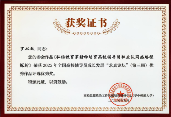 论坛期间还公布了本届“求真论坛”优秀作品评选结果。罗从政提交的论文《弘扬教育家精神培育高校辅导员职业认同感路径探析》荣获优秀奖。