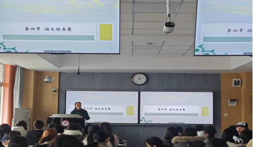 本次示范课以“词义的类聚”为主题,史丰教授巧妙挖掘语言学知识中蕴含的思政元素,实现了专业知识讲授与价值引领的有机统一。课程从“家园”“奋斗”“担当”等富有时代特色的常用词切入,引导学生深入思考词义类聚背后的文化逻辑与价值导向。她在讲授中指出,汉语词汇不仅是沟通交流的工具,更是中华文化传承与时代精神表达的重要载体,词义的聚合关系生动体现了中华民族的思维方式与价值观念。