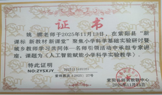 2025年11月13日,紫阳县“新课标、新教材、新课堂——聚焦小学科学基础实验研讨暨名师引领主题研修活动”在县第二小学开幕。活动由紫阳县师训教研中心组织,为期两天,全县50余名小学科学教师参加。我院教师姚娜作为特邀专家出席并作专题报告。