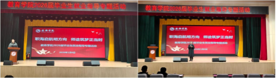 王毅作就业动员讲话。他结合往届就业数据与典型案例,分析教育领域当前机遇与挑战,鼓励毕业生树立“先就业、后择业”的务实观念,积极关注民办教育、早期发展、特教、教育科技等多类就业方向,并强调就业对个人成长、家庭期待与社会责任的重要意义。他寄语同学们保持积极心态,夯实专业能力,主动作为,稳步前行。