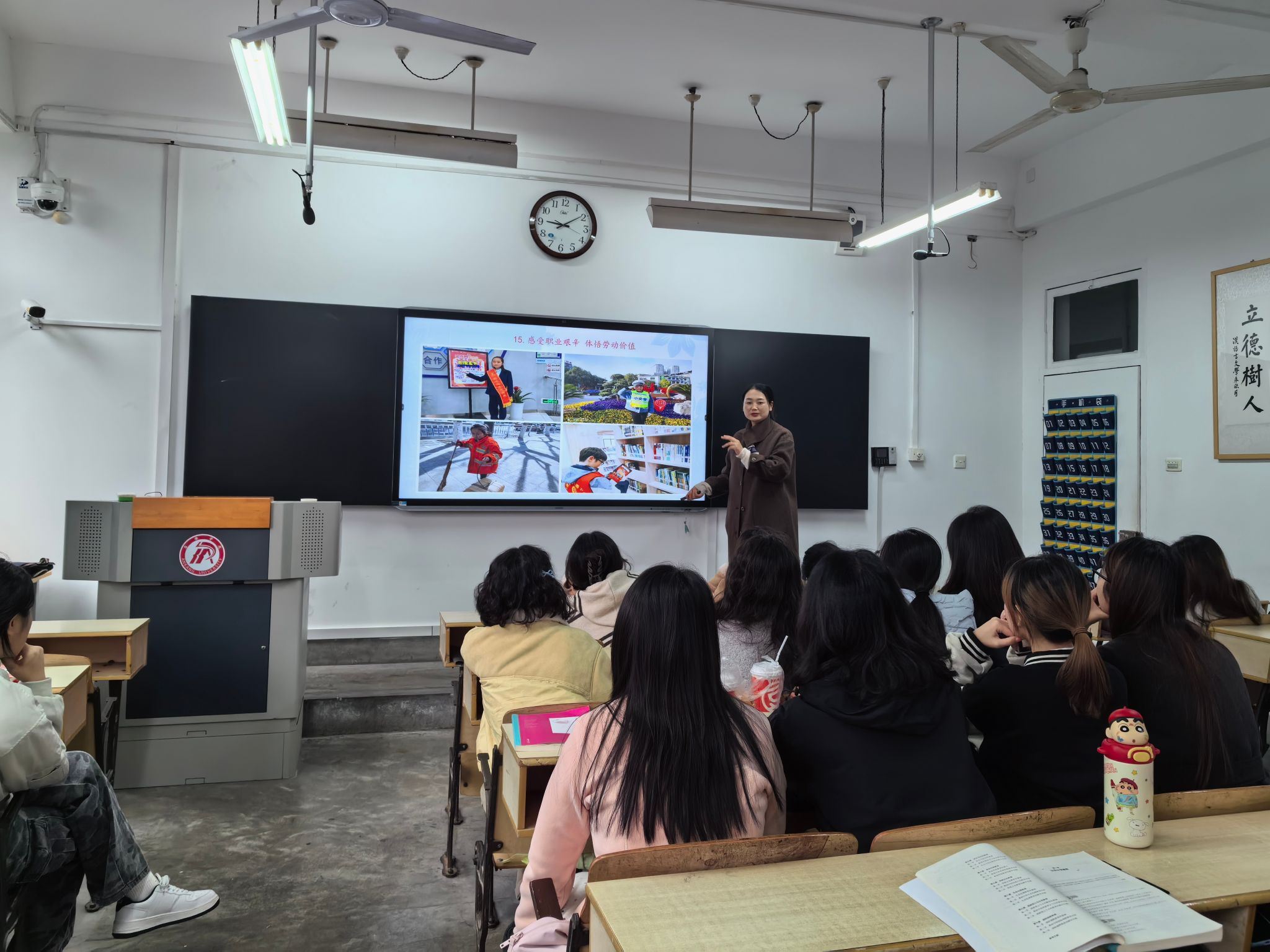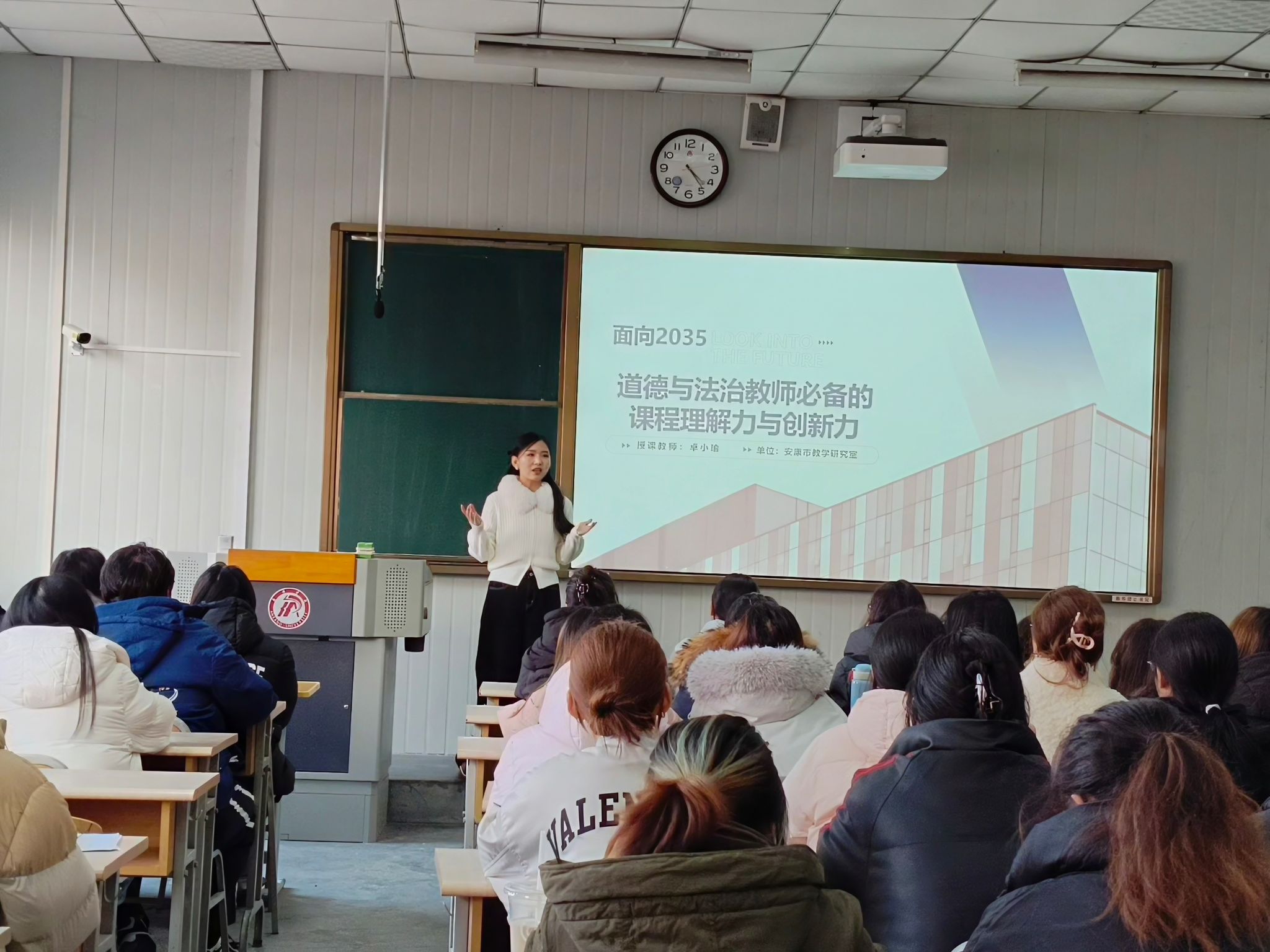 全国优秀教师、安康市道德与法治教研员卓小瑜老师以《面向2035:道德与法治教师必备的课程理解力与创新力》为题,高瞻远瞩地剖析了未来教育趋势对道德与法治教师核心能力的新要求。安康小学德育研究会会长、汉滨区小学校长、特级教师肖静老师立足《核心素养导向下的小学道德与法治新教材解读与教学建议》,为学生们提供了驾驭教材、落实素养的实用路径。汉滨区道德与法治研究员陈婵老师则从《以劳促品德 以动促成长》的角度,生动阐释了劳动教育与品德培养有机结合的创新实践。安康市瀛湖小学副校长郭娟老师聚焦《小学道德与法治教师教学技能》,分享了课堂管理、活动组织、评价反馈等方面的实战技巧。小学道德与法治省级教学能手、安康市汉滨小学政教处主任胡苗苗老师,更是以《如何做一名幸福快乐的小学道德与法治教师》为主题,传递了宝贵的职业信念与积极从教的心灵力量。