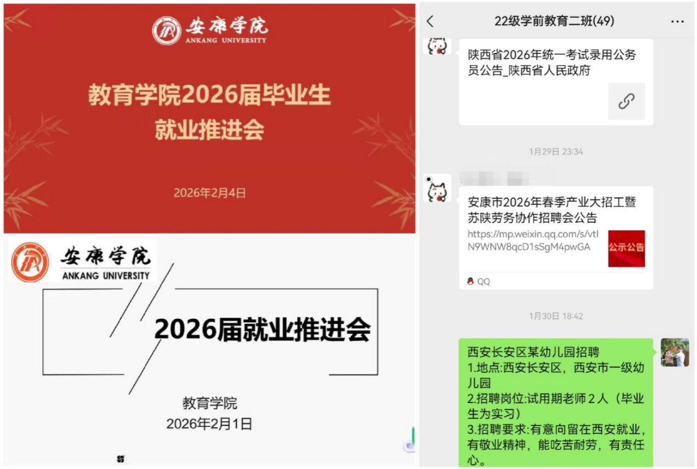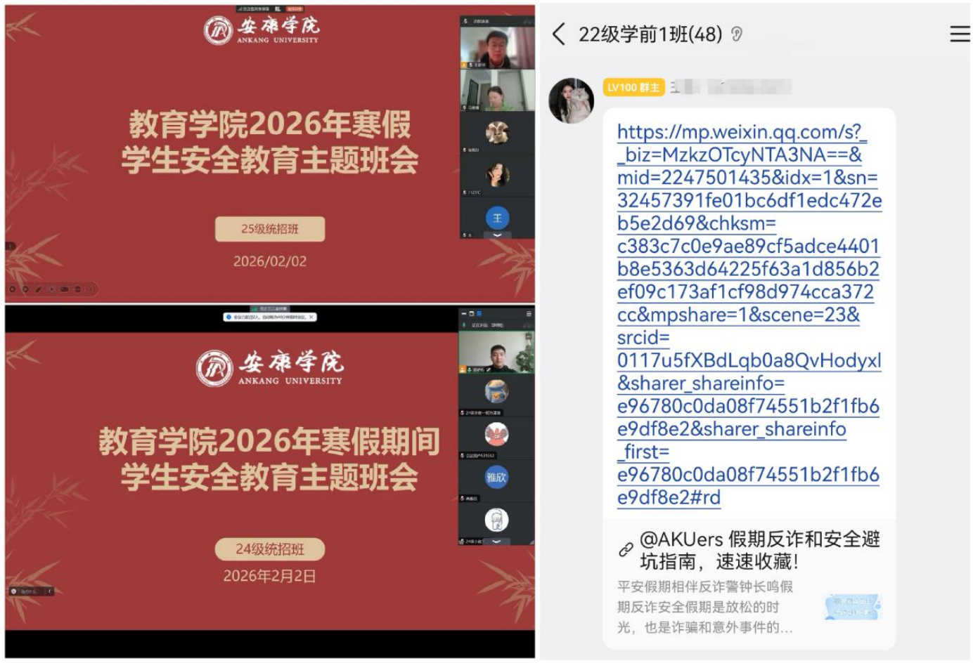 面向毕业班学生,学院在开展安全教育的同时,统筹推进就业指导与服务。各毕业班辅导员组织召开就业推进线上班会,解读相关政策、分享成功就业案例、提示招聘陷阱注意事项,分类了解学生就业进展与具体困难,提供个性化帮扶指导,并持续在班级群中推送招聘信息,实现安全教育与就业支持同步推进、同步落实。
