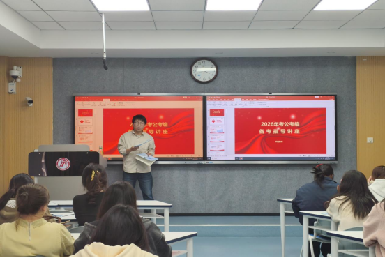 讲座中,讲师结合当前就业形势及丰富备考培训经验,围绕考公考编备考进行系统讲解。从考试政策、报考条件、岗位匹配等方面梳理了事业单位及公务员招考要点,并结合典型例题与历年考情,重点讲解判断推理模块的解题思路与应试技巧。在备考规划方面,讲师从时间安排、复习方法、面试准备等角度提出切实建议,引导学生在备考过程中主动思考、查漏补缺,稳步提升逻辑思维与综合应试能力。互动环节,讲师就岗位选择、分值分布、复习节奏等问题进行细致解答,现场气氛热烈。