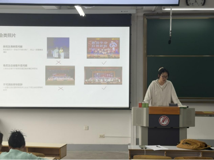 学院学生会媒体宣传部副部长张静瑶围绕摄影技能开展专项培训。她结合日常工作实际,从活动摄影构图、光线运用、场景抓拍等实用技巧入手,通过案例讲解与实操分析,帮助参训学生干部掌握基础摄影技能,提升学院宣传工作质量。