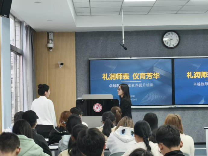 培训现场,邸玲教授聚焦教师礼仪素养,从教师仪容仪表、言行举止、课堂礼仪等方面进行全面讲解,通过理论阐述与现场示范相结合,引导同学们树立良好的教师职业形象,践行师德礼仪规范。王康老师围绕课件制作核心要点展开细致指导,结合教学实际,讲解课件设计技巧、素材运用、页面优化等实用内容,帮助同学们掌握规范且高效的课件制作方法,提升信息化教学能力。