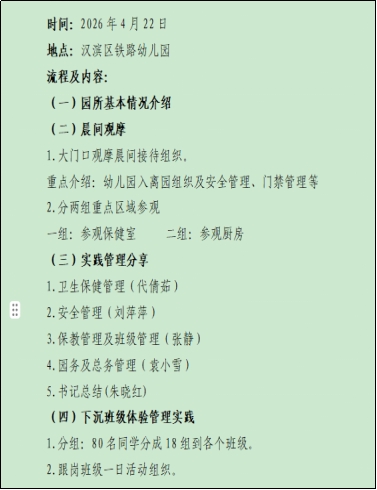 2026年4月22日,为深化理论知识与教育实践的融合,提升学前教育专业学生的专业素养与实践能力,教育学院学前教育专业23级本科班全体同学,在授课教师王丽娟的带领下走进汉滨区铁路幼儿园,开展了为期一天的幼儿园管理课程现场教学活动,在真实的幼教场景中汲取经验、锤炼本领。