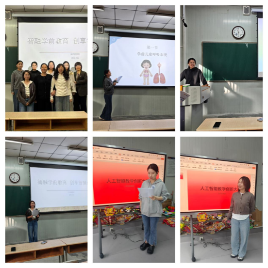 为深入推动人工智能与学前教育专业教学深度融合,全面提升教师数字化教学创新能力与实践应用水平,4月22日下午,教育学院学前教育系首届人工智能教学创新应用能力大赛初赛在1035及1014教室顺利举办。本次大赛以“智融学前教育 创享智慧课堂”为主题,全系教师全员参与,以试讲展示的形式共同探索人工智能赋能学前教育教学的新路径、新方法。