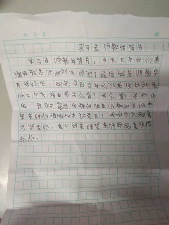 临近元旦,学校组织诗歌朗诵活动,这个孩子因为诗歌背诵不下来,连着两个下午被班主任留下背诵。在和班主任沟通之后,我决定发挥专业所长指导他背诵诗歌,我选的诗歌是《延安,我把你追寻》。辅导中,发现小孩总是偷偷地看我,得到了老师的关心,他显得非常兴奋,眼神中透露着开心。在朗读中发现孩子存在发音不标准、节奏难以把握等问题,作为一名语文老师、一名土生土长的延安人,我将手机里拍的延安风采和他一一分享,给他讲解其中的故事,从字词发音、诗歌节奏、感情表达等方面逐字逐句辅导。他从最初的不自信、羞于开口,到能够流畅、感情饱满地诵读。最终,带着对延安的向往、对延安精神的崇敬,他真正走进了这首诗歌,班主任对他也刮目相看。第二天早上,我的办公桌上多了一份小作文,题目是《实习老师教我背书》。