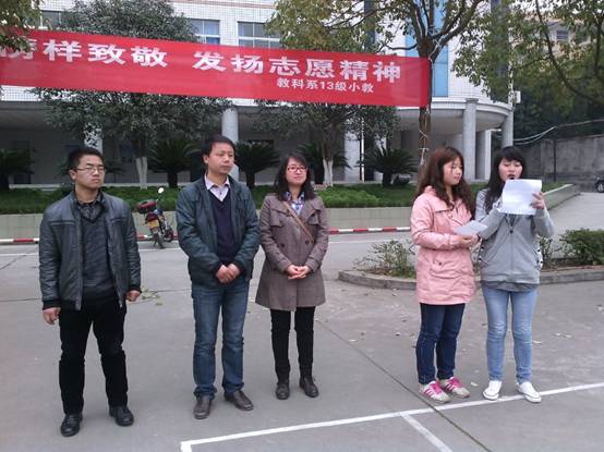 进入三月“学雷锋活动月”,我校掀起以实际行动纪念雷锋的热潮。各种以学雷锋为主题的公益活动贯穿整个三月,各班都以义务劳动、同学互助、社会实践等形式,在理解爱、感受爱、传递爱的过程中,大力学习、弘扬和践行雷锋精神。13级小教理、小教文1、小教文2为响应校团委的号召,在教科系团总支的倡导下,联合组织开展了学雷锋活动,3月12日,三个班的同学在安康学院前操场举行学雷锋活动动员大会,动员大会鼓舞了同学们参与学雷锋活动的士气,接着13级小学教育各班有组织有计划地进行本班的学雷锋活动。