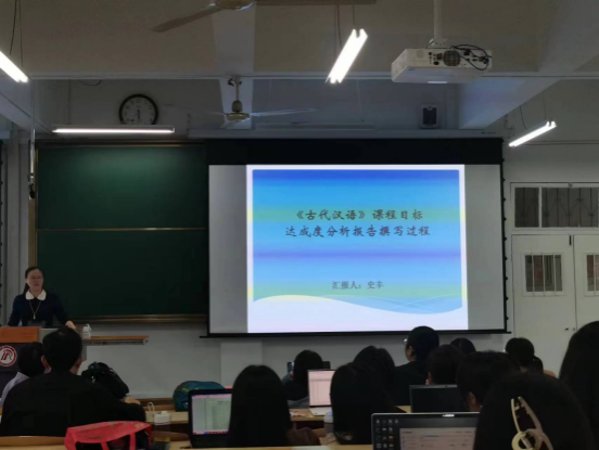 本次汇报由两部分组成。第一,刘铁副处长从教师实践困扰出发,就教师在撰写课程达成度目标分析报告的难点、疑点进行一一解答。第二,教育学院史丰教授从《古代汉语》课程出发,分享了自己撰写过程与心得。课程目标达成度的本质在于“确定细化目标”、“分类综合评价”、“弱项达成为要”,解决课程目标不明、一揽子评价的缺陷。与会教师纷纷感触颇深。会议氛围融洽,氛围浓厚。